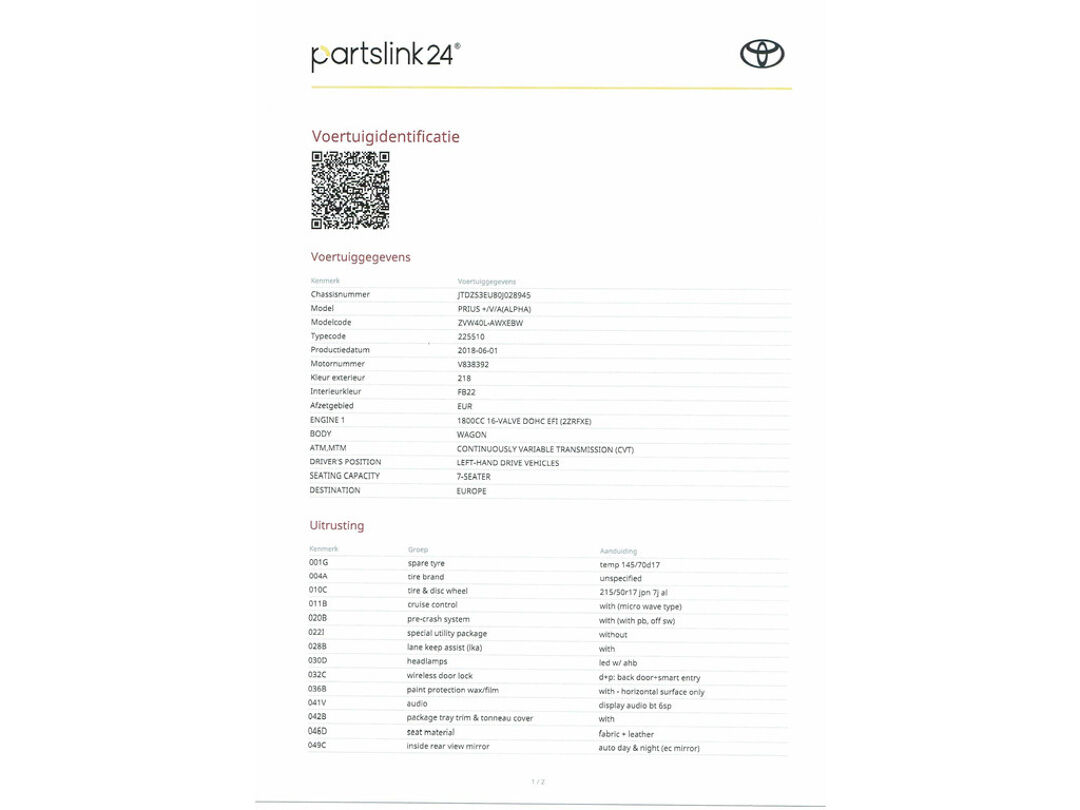 Volop ruimte voor uw gezin in deze Toyota Prius +. Hij is uit 2018 en er staat 98444 kilometer op de teller. Met zijn benzinemotor en automatische transmissie is dit een prima auto voor nog vele kilometers. Doe maar luxe! Neem plaats in de verwarmbare voorstoelen en voel de weldaad in koude dagen. Overdag een weidse zichthoek en 's avonds het lichtspel in de binnenruimte: dat geeft het glazen panoramadak! Bij de zeer complete uitrusting van deze auto behoren ook 17 inch lichtmetalen velgen, LED koplampen, halflederen bekleding, zwarte hemelbekleding, dakspoiler en donker getint glas achter.