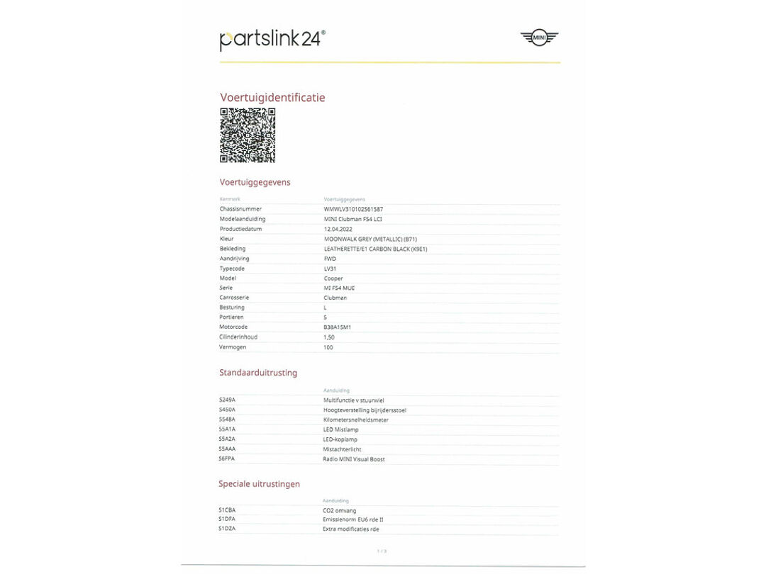 De MINI Clubman heeft een krachtig design, hij toont zelfverzekerd maar niet arrogant. Het is die uitstraling die deze auto zo aantrekkelijk maakt. Zijn rijkwaliteiten zijn navenant: achter het stuur van deze auto bent u iedere verkeerssituatie de baas, dankzij zijn krachtige motor en uitgekiende wegligging. De auto heeft een opmerkelijk lage kilometerstand van slechts 21506 De aandrijving van deze MINI wordt verzorgd door een driecilinder benzinemotor en een handgeschakelde zesversnellingsbak. De lederen bekleding benadrukt de luxe uitstraling van deze auto. Zijwaartse g-krachten worden solide opgevangen door de sportstoelen. Overdag een weidse zichthoek en 's avonds het lichtspel in de binnenruimte: dat geeft het glazen panoramadak! Natuurlijk behoren 18 inch lichtmetalen velgen, LED koplampen, sportonderstel, zwarte hemelbekleding, dakspoiler en getint glas ook tot de uitrusting van deze complete auto.